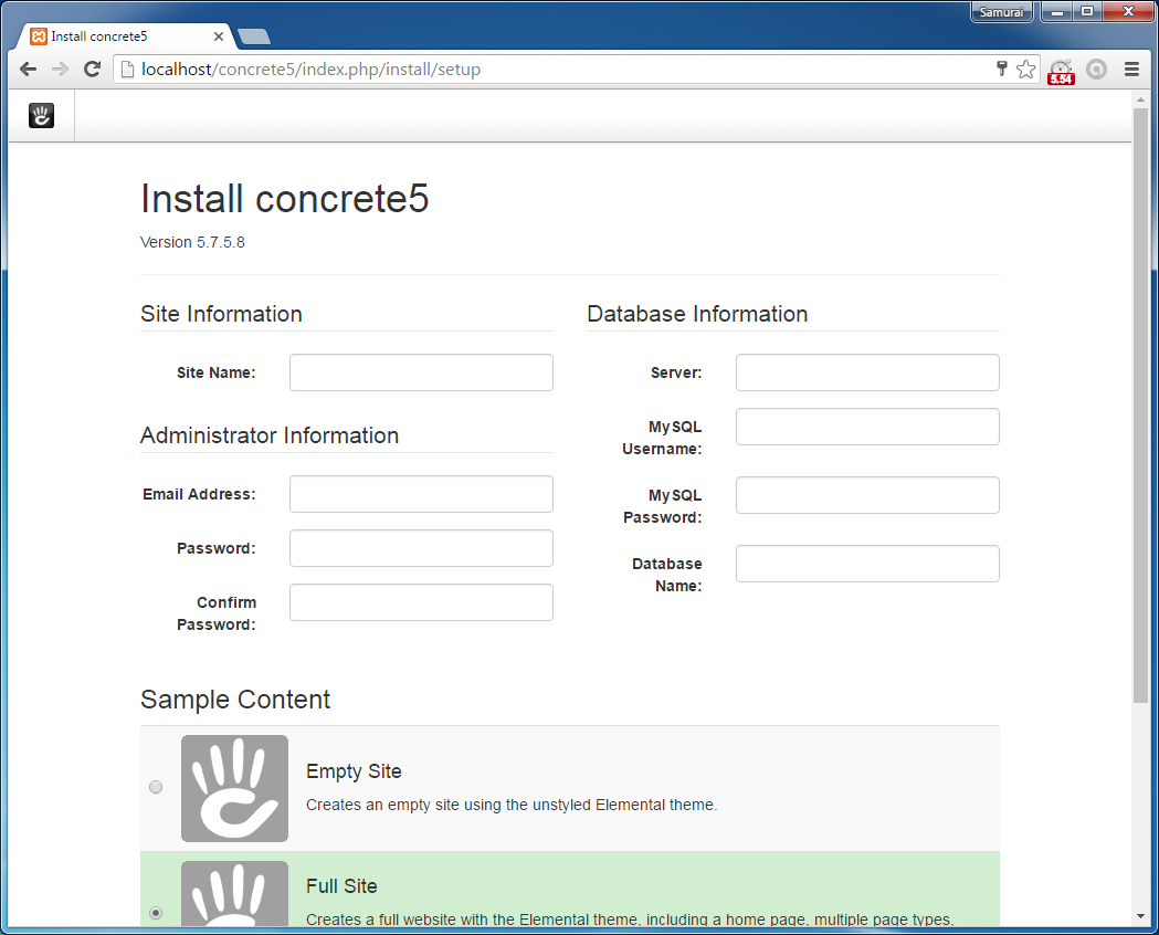 Go back to Concrete5 (5.7.5.8) CMS installarion page – fill all fields